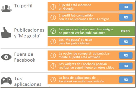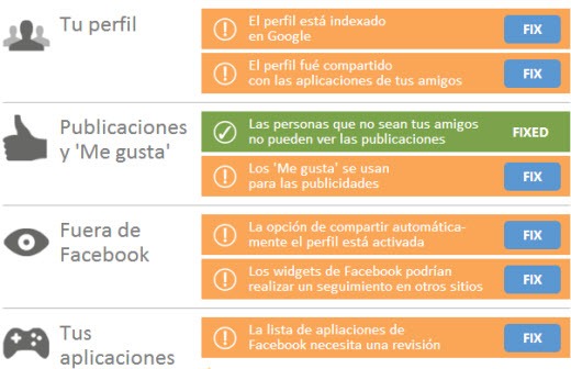 Las opciones que presentan un botón FIX a la derecha indica que con ese botón se corrige la situación; si es verde la opción y está la palabra FIXED es correcto.