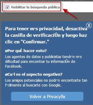 Cuando pulsas en una opción Privacyfix te lleva a la pantalla de configuración correspondiente y te explica qué supone desactivar o activar una opción. Aquí tengo habilitada la búsqueda pública, la desactivo y luego pulso Volver a Privacyfix.