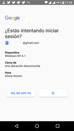 Esto también sirve si alguien ha conseguido nuestro usuario/contraseña del servicio e intenta entrar: entonces nos aparecería en el móvil este mensaje indicando que alguien (que no somos nosotros) intenta identificarse en el servicio, debemos pulsar NO y cambiar la contraseña ipso facto.